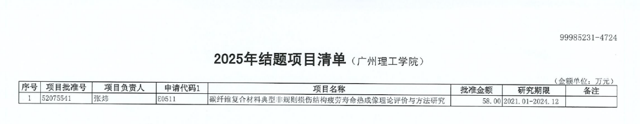 近日,我校接到国家自然科学基金委员会通知,KY开元集团张炜教授主持的国家自然科学基金项目《碳纤维复合材料典型非规则损伤结构疲劳寿命热成像理论评价与方法研究》(批准号52075541),通过国家自然科学基金委员会验收,顺利如期结项。