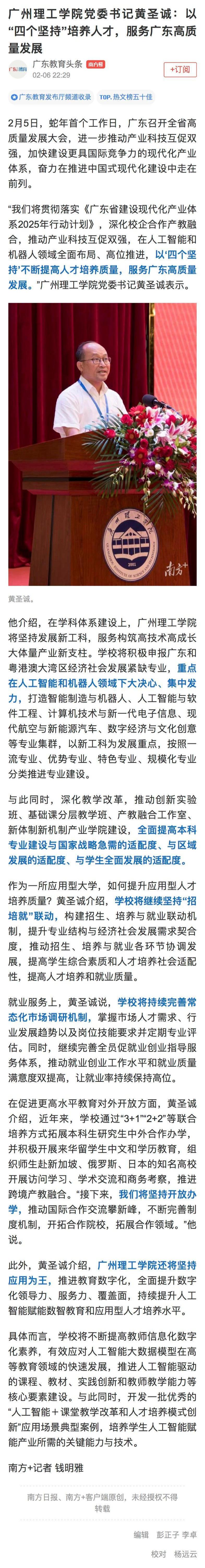 2月5日,广东省委、省政府召开全省高质量发展大会,进一步推动产业科技互促双强,加快建设更具国际竞争力的现代化产业体系,奋力在推进中国式现代化建设中走在前列。我校党委书记黄圣诚接受南方日报采访,介绍广州理工学院助力广东高质量发展举措。他表示,我们将贯彻落实《广东省建设现代化产业体系2025年行动计划》,深化校企合作产教融合,推动产业科技互促双强,在人工智能和机器人领域全面布局、高位推进,以“四个坚持”不断提高人才培养质量,服务广东高质量发展。