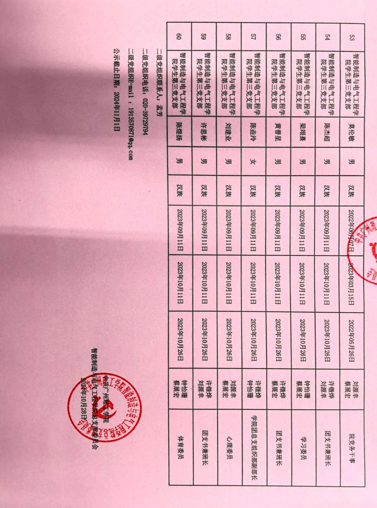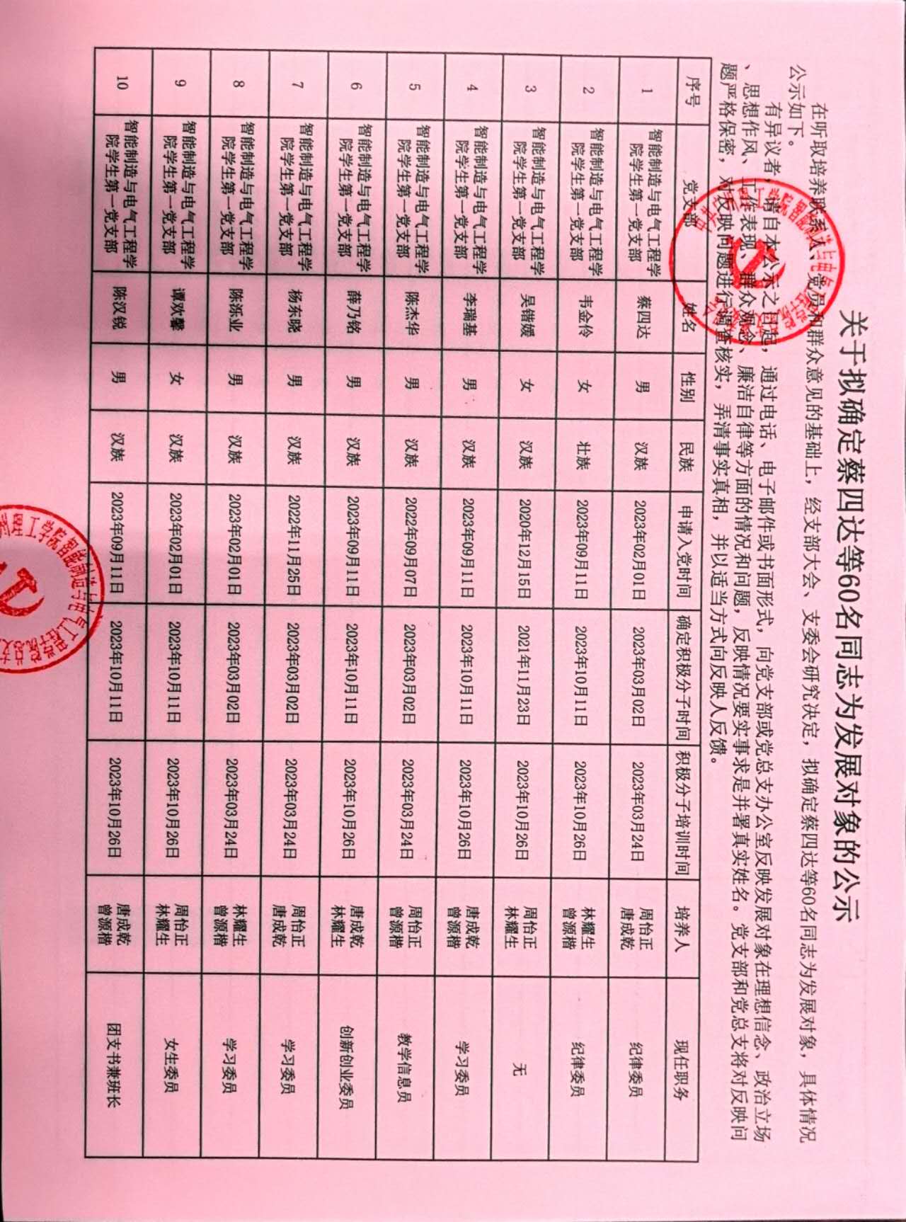 在听取培养联系人、党员和群众意见的基础上,经支部大会、支委会研究决定,拟确定蔡四达等60名同志为发展对象,具体情况公示如下。