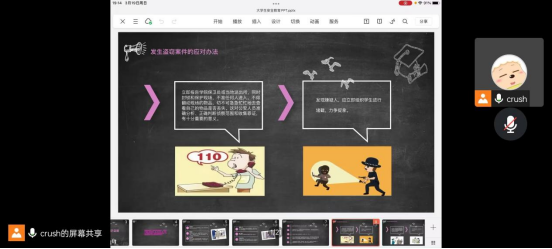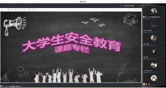 3月19日晚,为增强同学们的安全防范意识,提高同学们的安全防范能力,全面普及安全常识,学院在线上召开大学生安全教育主题班会,班会由辅导员老师主持,全体学生参会。