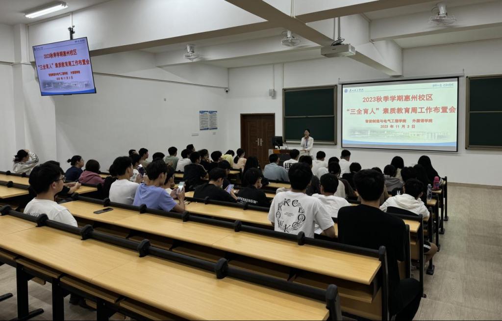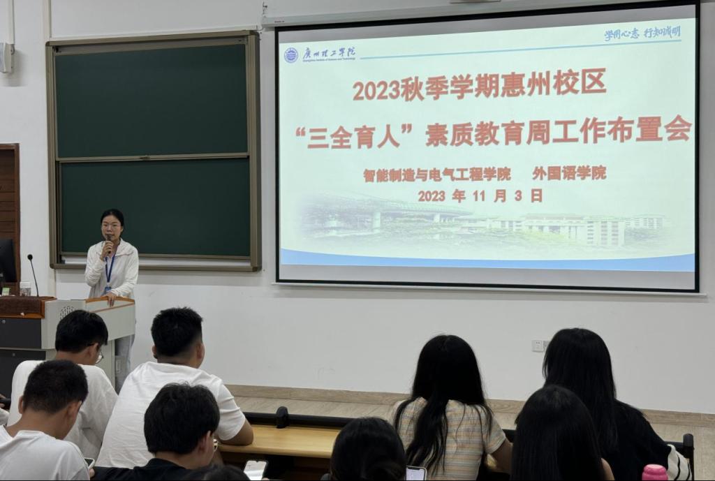 谢老师首先讲解了我校惠州校区2023学年秋季学期“三全育人”素质教育周活动的活动模块、活动内容、参与人员等内容;其次从活动流程、注意事项等方面对此次素质教育周工作进行整体部署;最后,谢老师指出,“三全育人”素质教育周工作对于丰富学生课余生活,提升学生综合素质有重要意义,全体师生需上下一心、高度配合、积极参与。