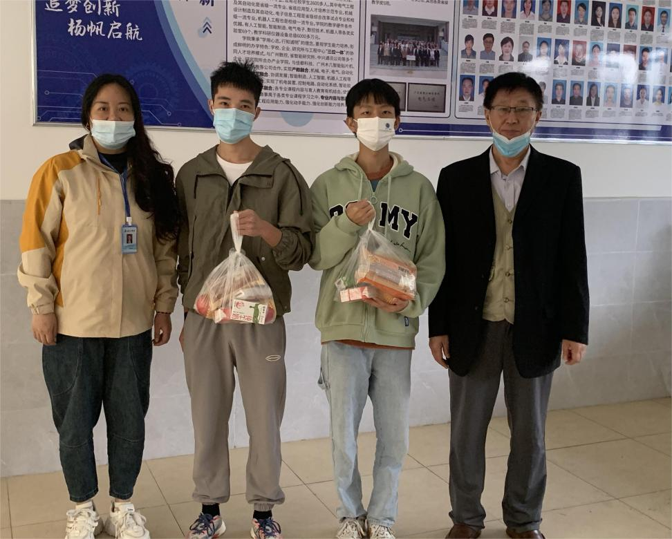 11月30日,为筑牢疫情防控安全堡垒,用暖心行动落实疫情防控工作,智电学院院长李玉忠、党总支书记吕在艳、全体辅导员老师、学生志愿者们于工程楼2楼为全院同学发放防疫爱心礼包。