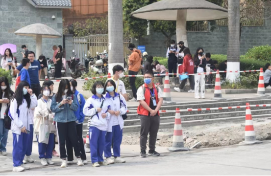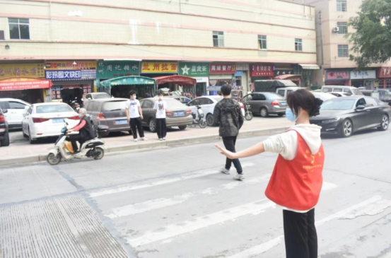 志愿者们身穿红马甲,手持文明交通宣传旗,为即将赴考的考生指引道路,确保考生顺利通行,平安到达考场。同时,倡导考场附近的商户和过往的车辆及行人在考试期间采取“静音模式”,助力考生顺利完成全国英语等级考试。