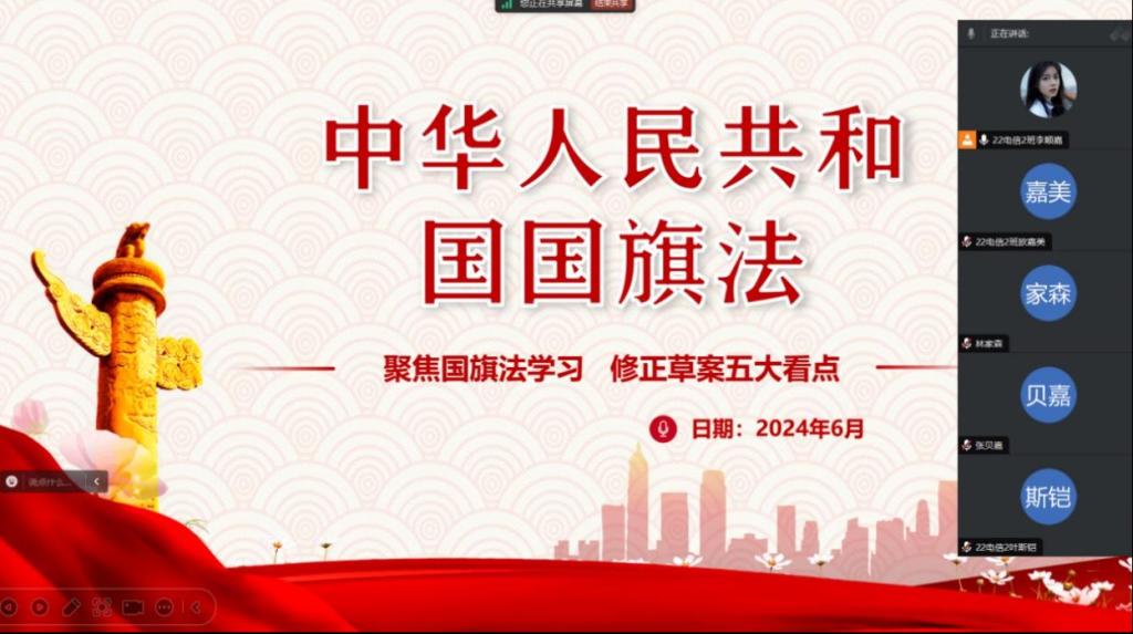为呼吁同学们共同遵守《中华人民共和国国旗法》,尊重并维护国旗的尊严和荣誉,智电学院于6月10日组织各班级召开“聚焦国旗法学习,了解修正草案五大看点”的线上主题班会。班会内容着重强调了维护国旗尊严的重要性,并鼓励同学们积极参与国旗的升挂、使用和保护,共同为弘扬爱国主义精神贡献自己的力量。