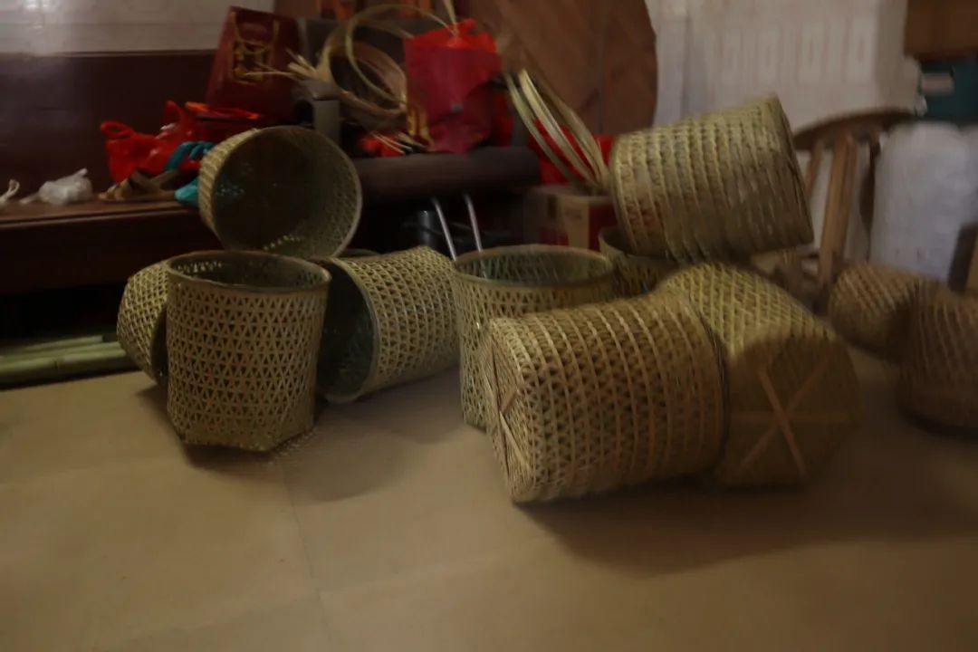 夏日炎炎,阿嬷们三两成群地聚在屋檐下编织竹篮,闲聊的同时十指翻飞,手上编织竹篾的速度丝毫不减。见到队员们来寻访时也是热情的把大家迎进屋内,为我们介绍正在编织的手工艺品。屋内是阿嬷们已经编制好的竹篓、灯笼、杯套等制品。据一位阿嬷介绍,编织洋篮的步骤繁多,从一根青翠的竹子加工成一条薄薄的篾片,再经过编织做成洋篮,往往经历数十个步骤,耗费大量的精力,但是做出来的洋篮收购价格又不高,因此现在洋篮的制作工艺已经出现严重的断层,已经很少有年轻人去学习这项技艺了。