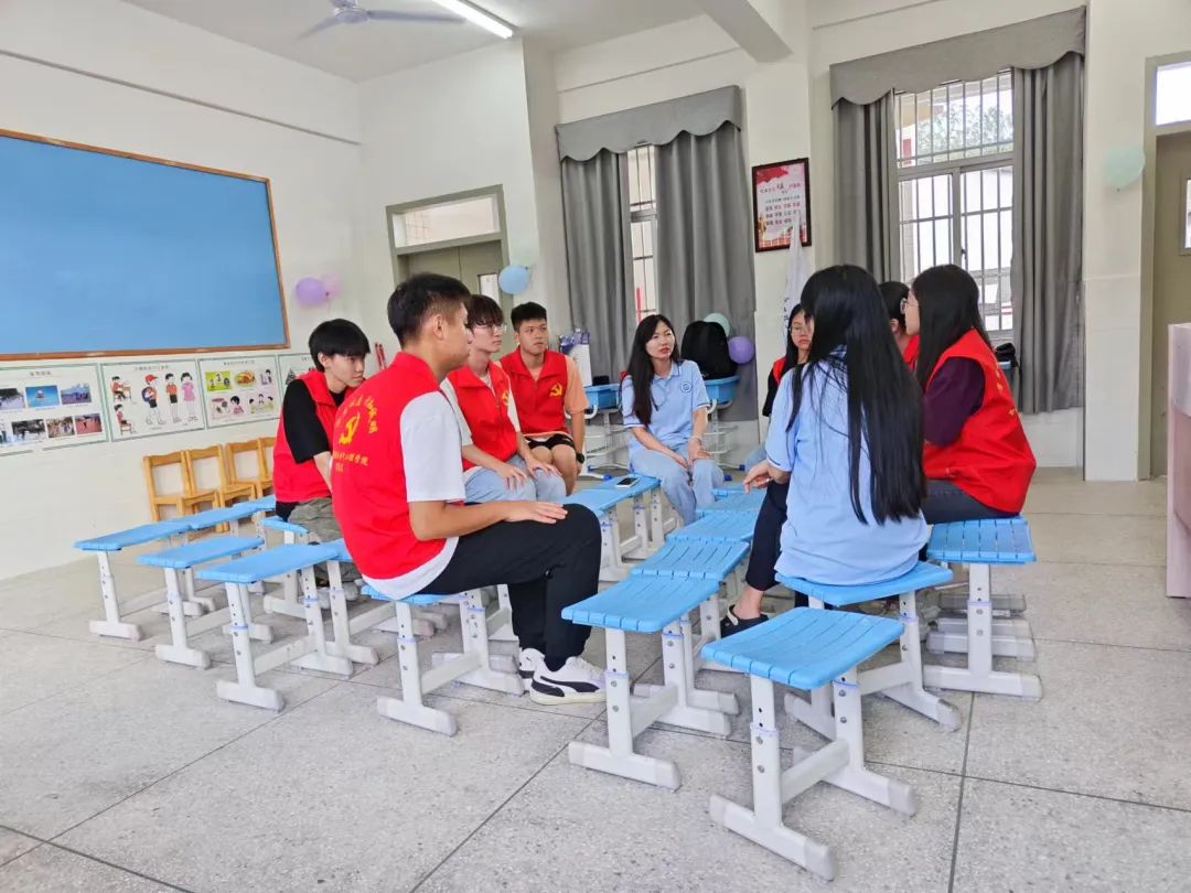 7月15日上午,广州理工学院创想突击队师生与梅蓄新村的温载佑书记、温崇金主任以及志愿者负责人开展专题座谈,深入讨论活动行程安排、安全注意事项等关键议题。会上,梅蓄新村温载佑书记首先代表梅蓄新村对实践团的到来表示热烈欢迎和衷心感谢,他向实践团介绍梅蓄新村目前的发展及教育现状,他表示希望在实践团的共同努力下,梅蓄小学的教育质量能得到一定的提高。实践团简要介绍支教项目的基本情况和七天的支教安排,并表示将竭尽所能,为梅蓄新村的小学教育贡献青春力量。座谈会后,实践团在温老师的带领下,参观学校环境,熟悉基础设施和教学设备,为接下来的活动开展奠定基础。
