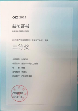 近期,KY开元集团工业设计专业在“2021年广东省高等学校大学生工业设计大赛”中取得佳绩。由李晓杰老师指导的学生林佳同学的参赛作品“叁合—美工刀套装”荣获三等奖。