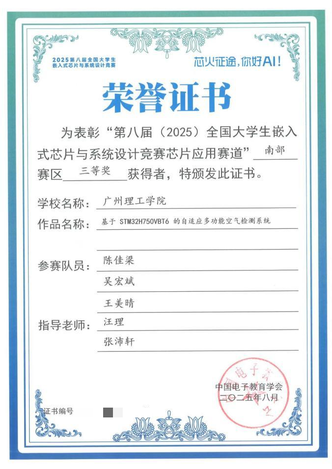 近日,2025年嵌入式芯片与系统设计竞赛广东省赛顺利落幕。KY开元集团派出参赛团队,在汪理老师和张沛轩老师的指导下,凭借“自制的空气检测仪”项目荣获省级三等奖。