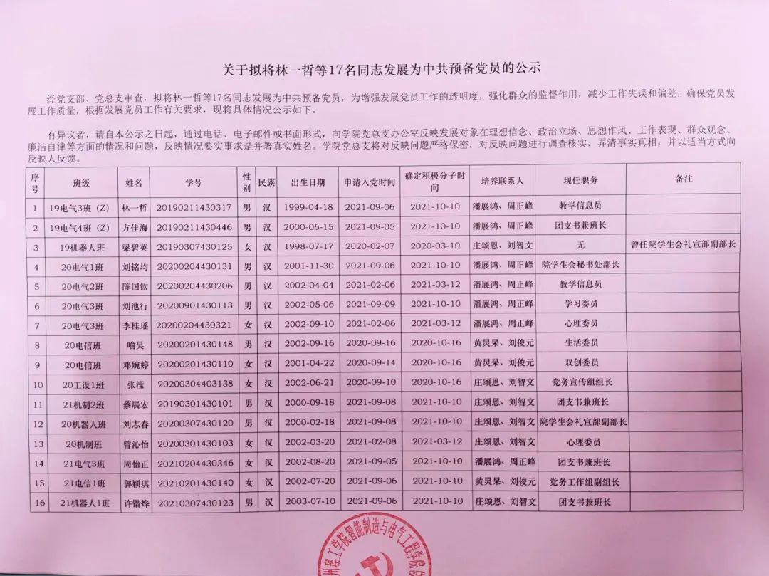 经党支部、党总支审查,拟将林一哲等17名同志发展为中共预备党员,为增强发展党员工作的透明度,强化群众的监督作用,减少工作失误和偏差,确保党员发展工作质量,根据发展党员工作要求,现将具体情况公示如下。