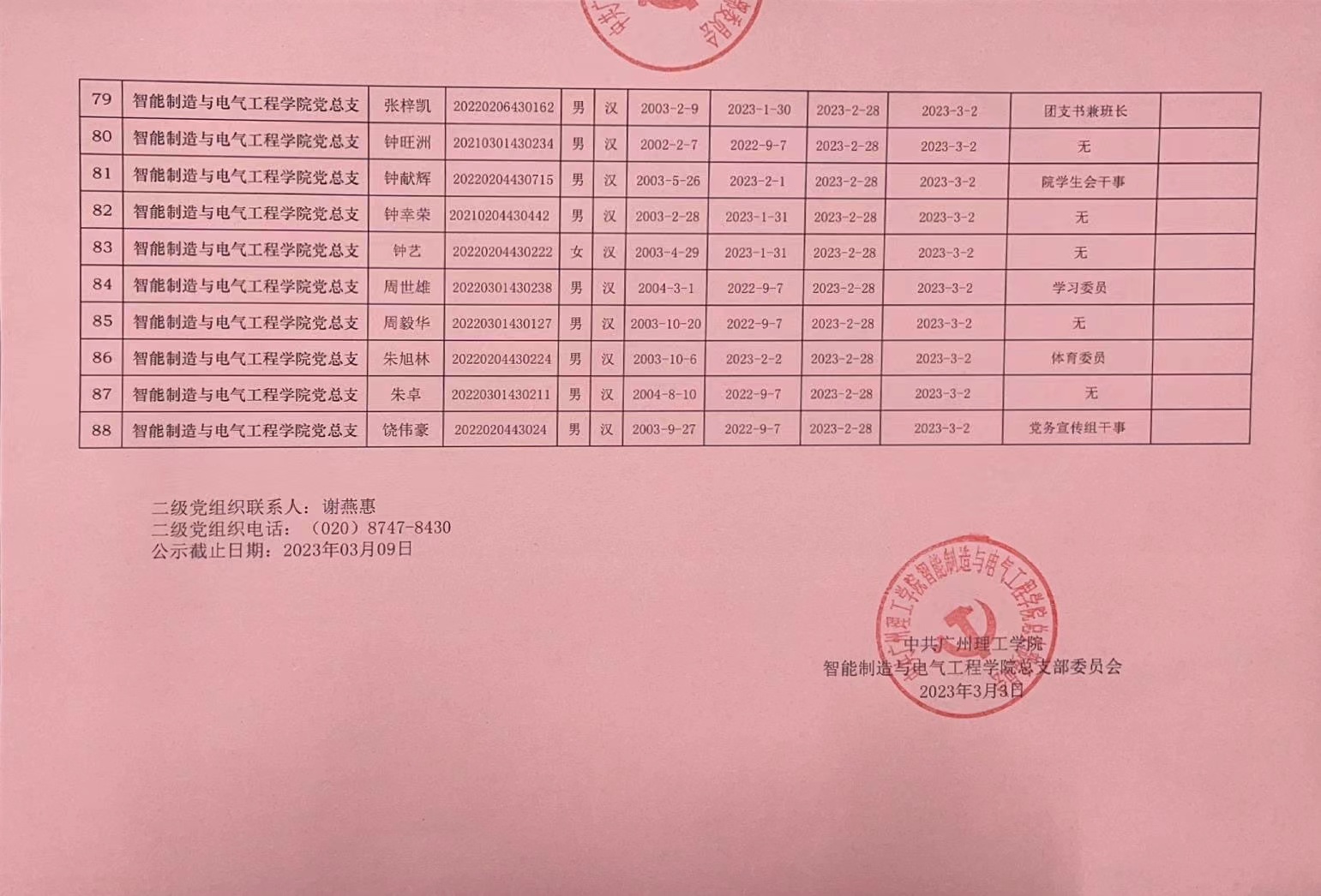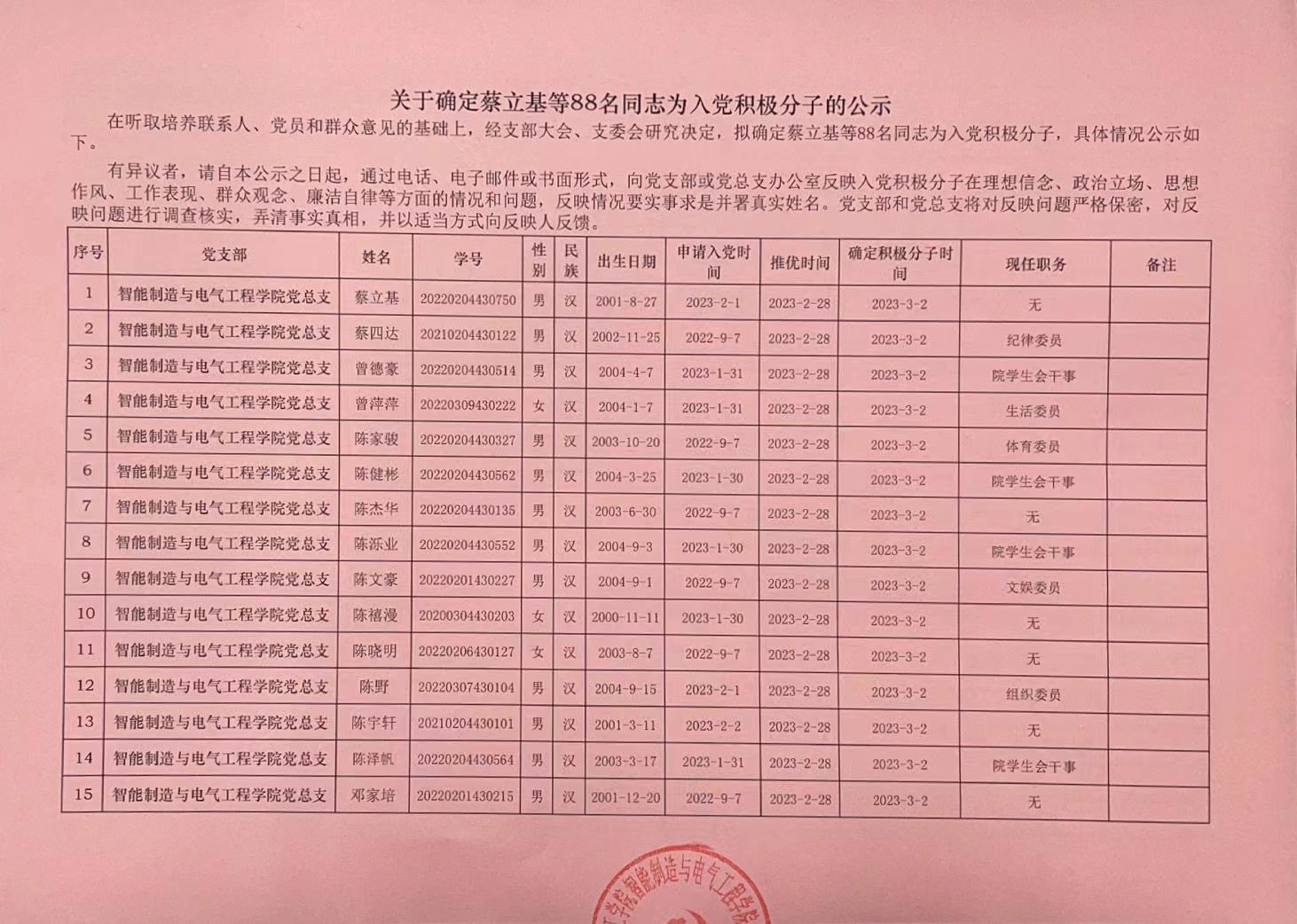 在听取培养联系人、党员和群众意见的基础上,经支部大会、支委会研究决定,拟确定蔡立基等88名同志为入党积极分子,具体情况公示如下。