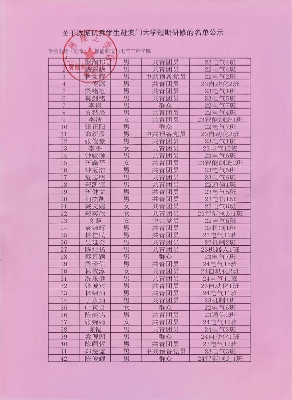 关于选派优秀学生赴澳门大学短期研修的名单公示