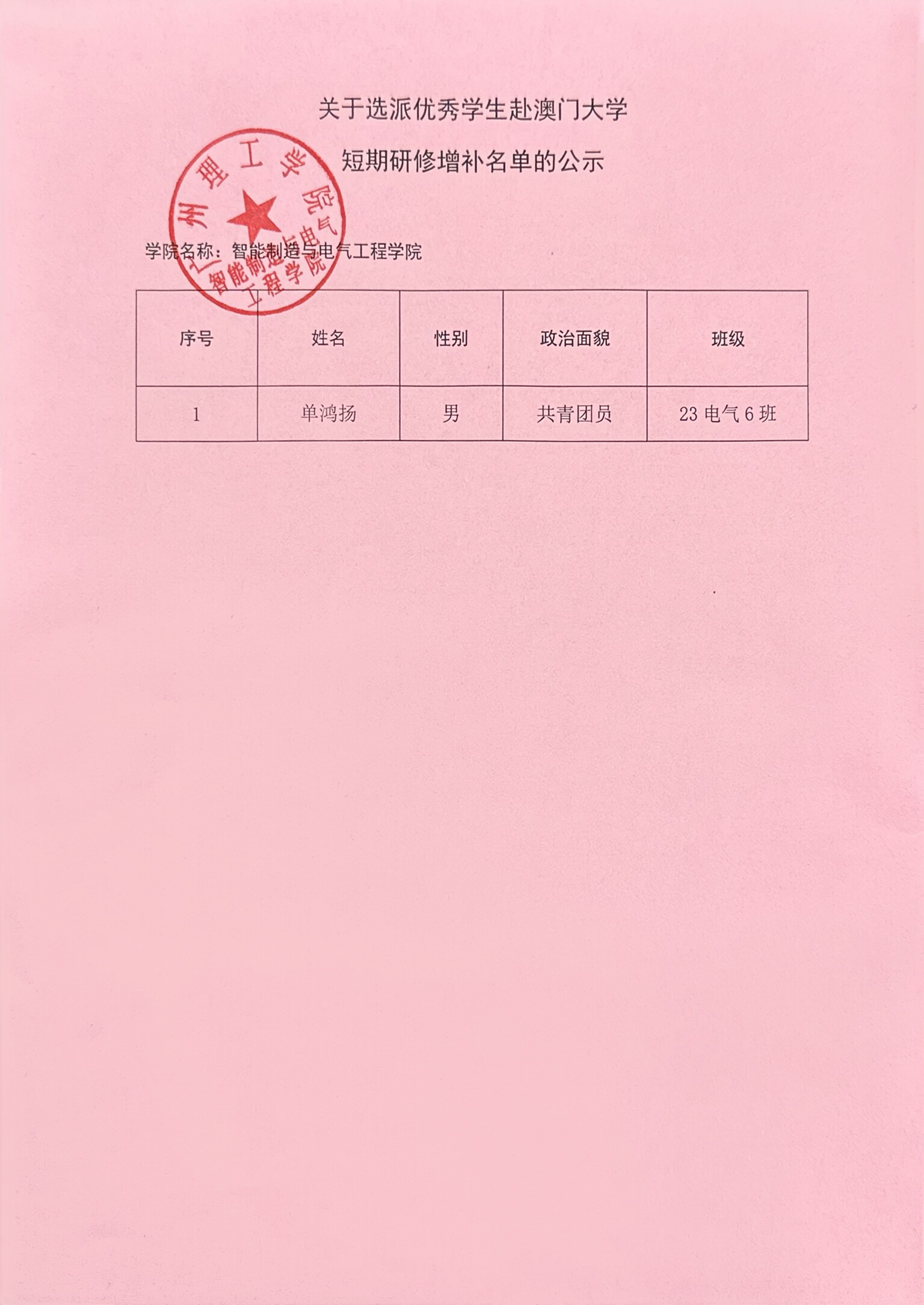 根据广州理工学院 《关于选派优秀学生赴澳门大学短期研修的通知》有关要求,我院经上级部门名单分配,新增1名额,按选拔积分明细表排名,增补单鸿扬同学,现予以公示,具体如下: