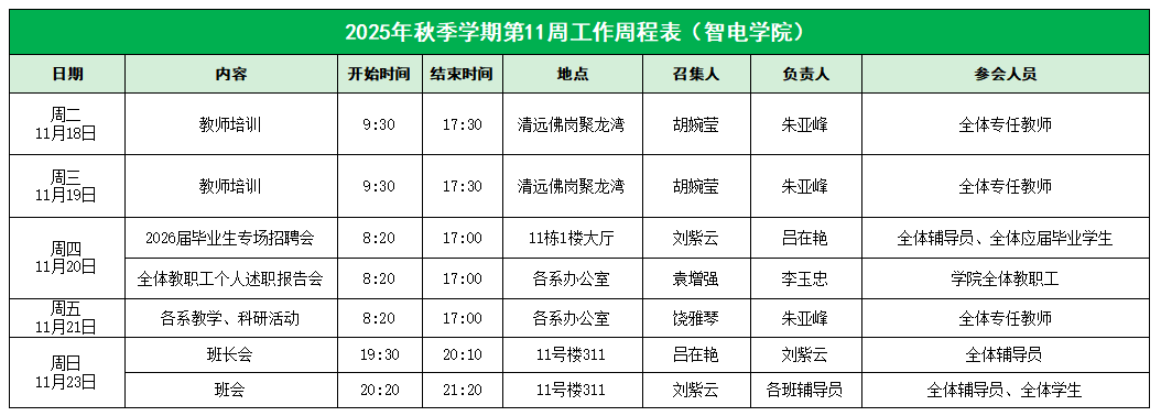 智电学院2025年秋季学期第11周工作周程表