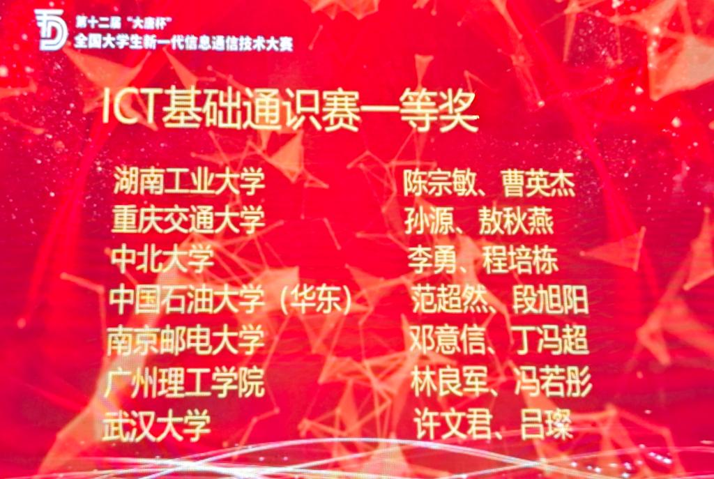近日,在刚结束的第十二届 “大唐杯” 全国大学生新一代信息通信技术大赛全国总决赛中我校KY开元集团学生取得了优异成绩。我校学生林良军、冯若彤组成的参赛团队在朱建兴、黄明浩老师的指导下,凭借扎实的专业功底与出色的临场发挥在“ICT基础通识赛道”荣获全国一等奖;王熠翔、何海斌组成的参赛团队在龚凡老师的指导下,通过系统的学习和模拟实战在“工程实践赛道本科B组”荣获全国三等奖。